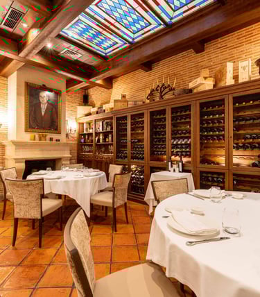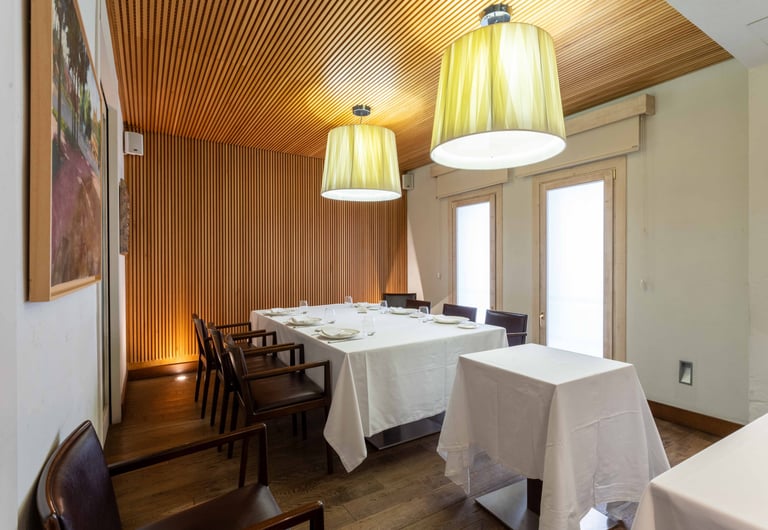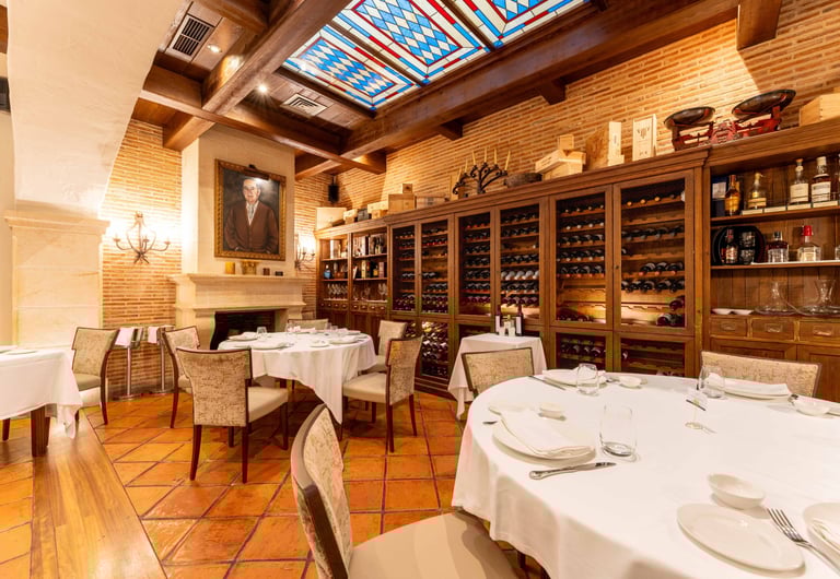 El comedor principal, presidido por un óleo histórico de Pascual Blanco, reúne el espíritu del mesón: un lugar donde la tradición familiar se combina con un servicio impecable y un ambiente acogedor. La bodega vista, integrada en la sala, añade personalidad y refuerza la experiencia del cliente al mostrar la cuidada selección de vinos que acompaña nuestra gastronomía.